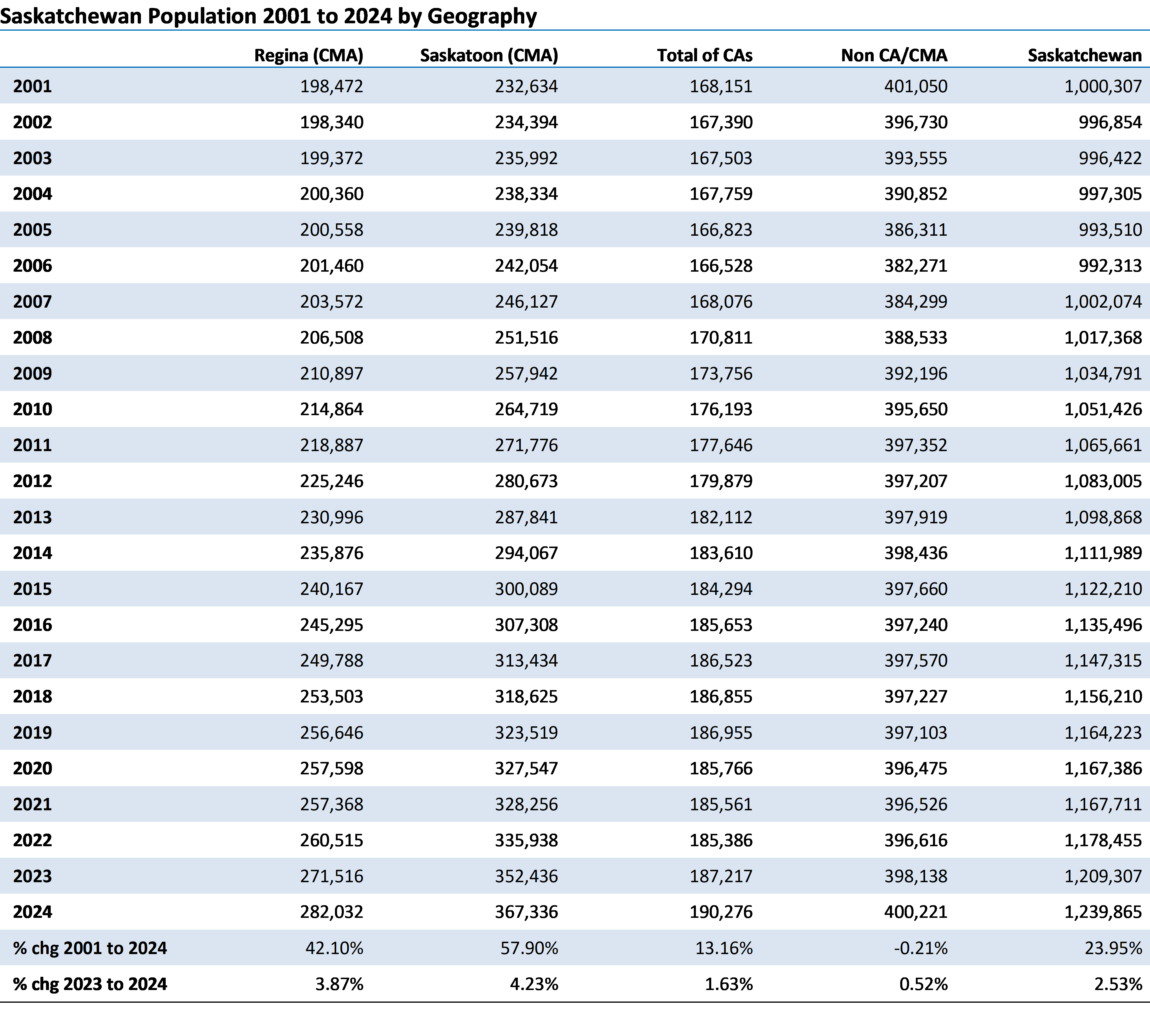 The data table summarizes the population trends in Saskatchewan from 2001to 2024, broken down into five categories: Regina (CMA), Saskatoon (SMA),Other Urban Areas, Rural Areas, and the total provincial population.